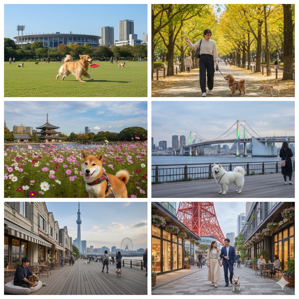 都立・区立の大規模公園やドッグランが点在し、鑑札と狂犬病注射済票の携行、リード着用が基本ルールです。